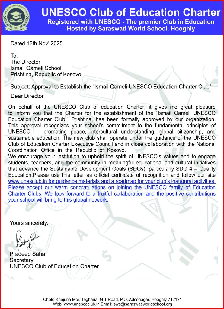 The UNESCO Club of Education Charter, an international initiative of CCLP Worldwide, is proud to announce the official establishment of the “Ismail Qemali UNESCO Education Charter Club” at Ismail Qemali School, Pristina, Kosovo. This approval marks a significant step in expanding the global community of UNESCO Education Charter Clubs committed to promoting peace, cultural harmony, and sustainable development through education.